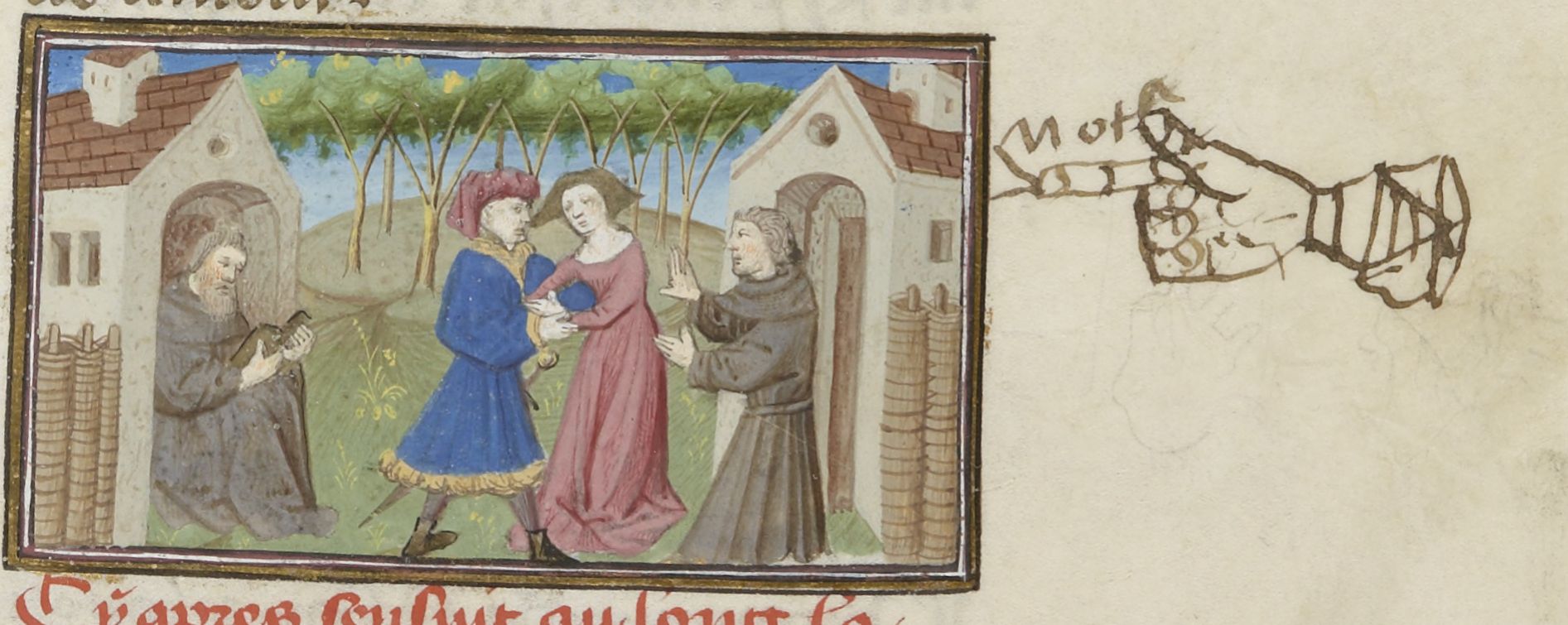 Parigi, Bibliothèque Nationale de France, Fr. 239, f. 106r. Il monaco Rustico siede nella sua capanna intento a leggere un libro; Neerbale fa allontanare Alibech da Rustico.