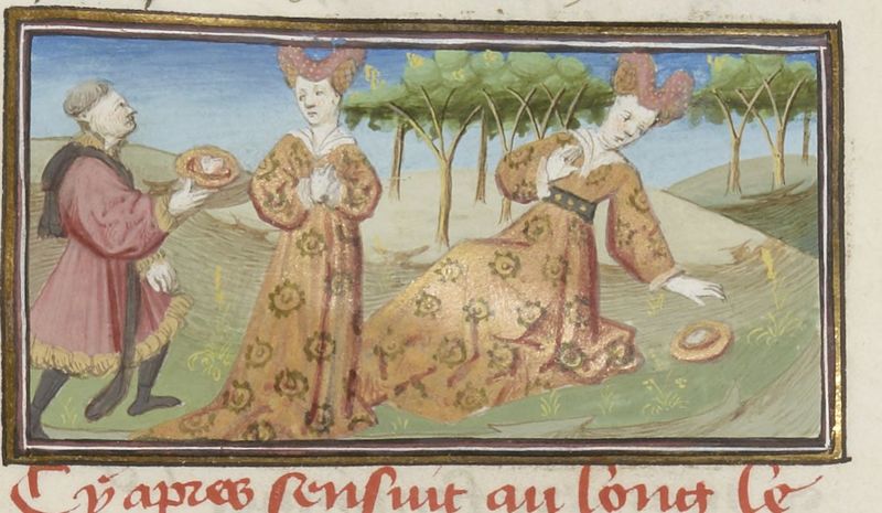 Parigi, Bibliothèque Nationale de France, Fr. 239, f. 112v. Tancredi (o un servitore?) consegna alla figlia il cuore dell'amante Guiscardo in una coppa; Ghismonda muore dopo aver bevuto del veleno dalla coppa stessa.