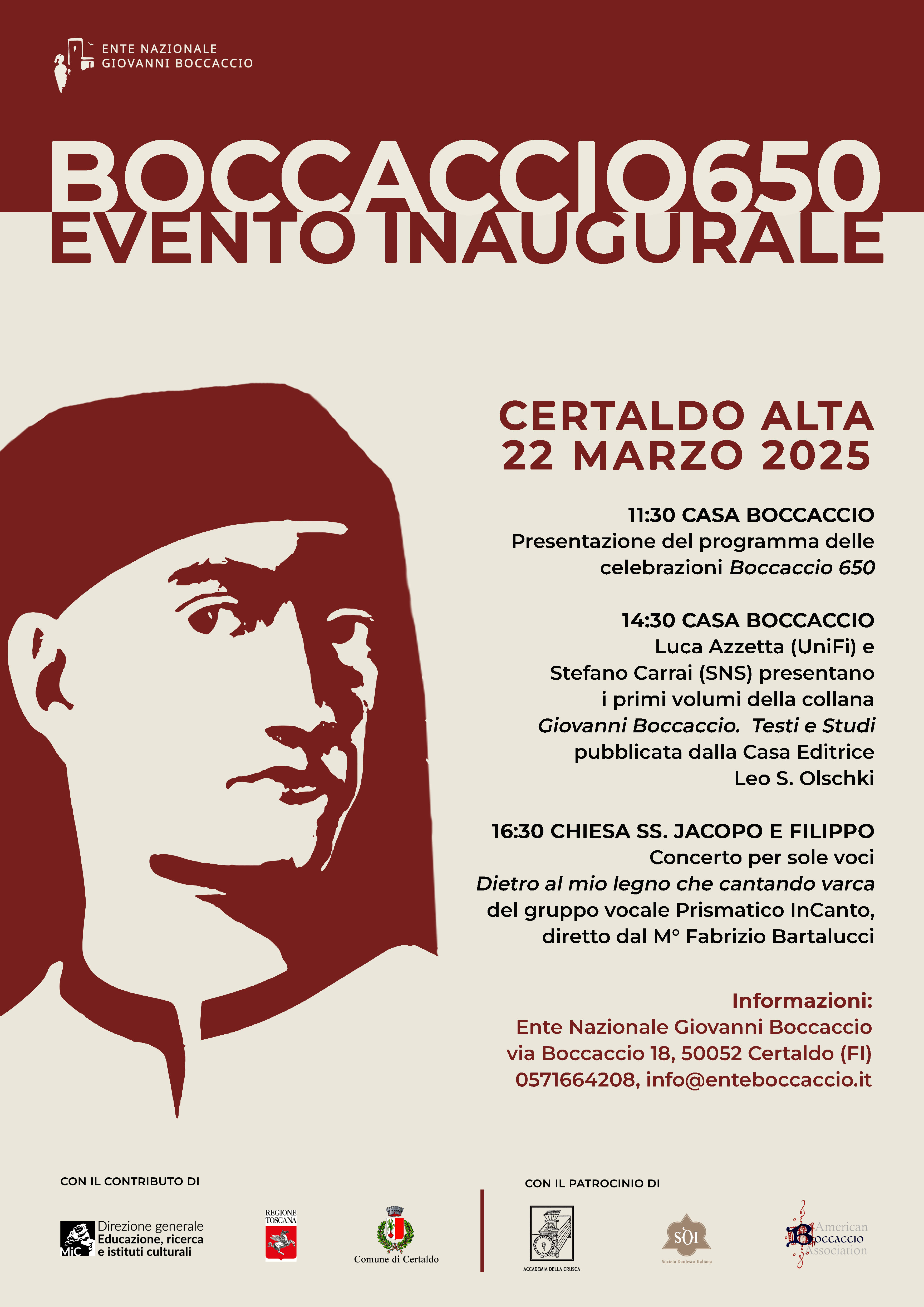 L'Ente Nazionale Giovanni Boccaccio inaugura le celebrazioni per il 650° anniversario della morte di Giovanni Boccaccio, il 22 marzo 2025 a Certaldo Alta, presso Casa Boccaccio e la Chiesa dei SS. Iacopo e Filippo.