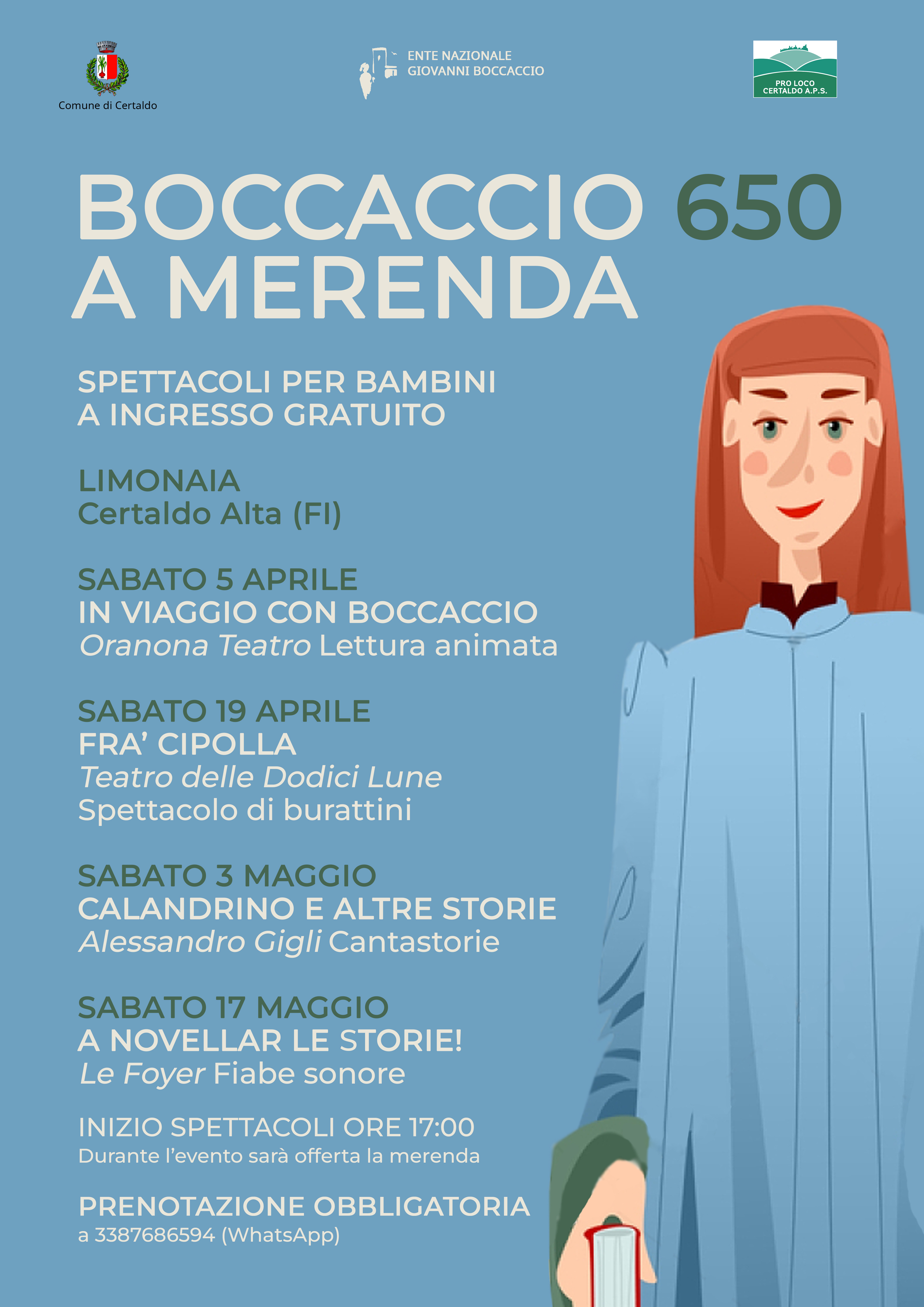 In occasione del 650° anniversario della morte di Giovanni Boccaccio, si terrà la rassegna di spettacoli per bambini "Boccaccio a merenda", un ciclo di quattro incontri che permetterà ai più giovani di scoprire le novelle del Decameron, reinterpretate attraverso stili performativi diversi e coinvolgenti. La rassegna inizierà, infatti, con una lettura animata che avrà come strumento narrativo principale il teatrino Kamishibai, il secondo incontro vedrà la magia dei burattini dar vita a personaggi vivaci e storie divertenti, a seguire un tradizionale cantastorie e infine, la rassegna si concluderà con le narrazioni sonore, un’esperienza immersiva che unirà suoni e parole.