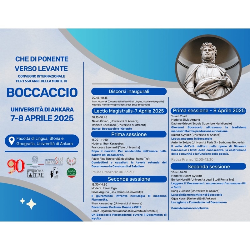 L’Ambasciata d’Italia ad Ankara, in collaborazione con l’Ente Nazionale Giovanni Boccaccio e l’Università di Roma Tre, promuove un convegno di due giorni su Giovanni Boccaccio (7-8 aprile), organizzato dall’Università di Ankara – Dipartimento di Italianistica, in occasione del 650° anniversario della morte dell’autore del Decameron, che ricorre quest’anno.