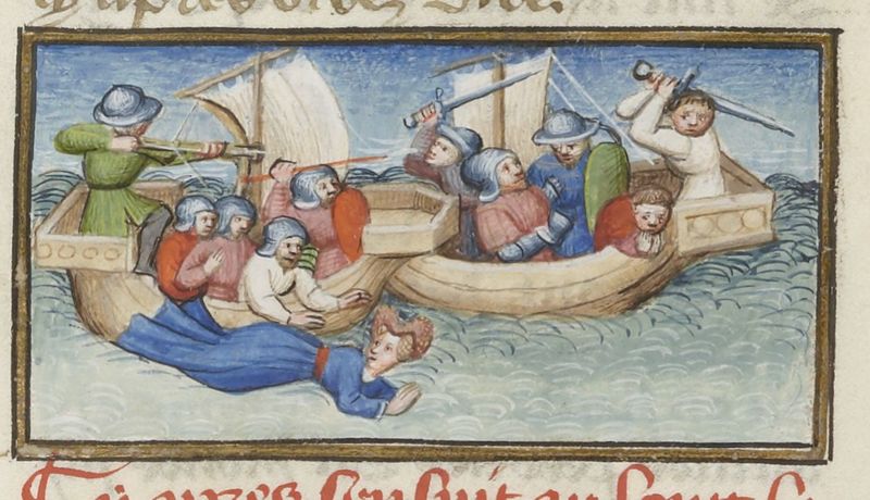 Parigi, Bibliothèque Nationale de France, Fr. 239, f. 123r. Durante una battaglia navale la figlia del re di Tunisi viene gettata in mare; sull'altro vascello Gerbino viene decapitato.