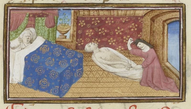 Parigi, Bibliothèque Nationale de France, Fr. 239, f. 125v. Lisabetta giace distesa nel suo letto, sul davanzale della finestra si trova una pianta di basilico; la serva ricuce il cadavere di Lorenzo nel sudario.
