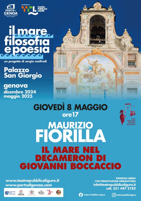 Penultimo appuntamento della quarta rassegna Il Mare – Filosofia e poesia a Palazzo San Giorgio creata da Teatro Pubblico Ligure con l’intervento di Maurizio Fiorilla, professore ordinario di Filologia della letteratura italiana all’Università di Roma Tre, su Il mare nel Decameron di Giovanni Boccaccio. Boccaccio sin dall’adolescenza imparò a conoscere il mondo del mare e dei mercanti, nel quale il padre sperava avrebbe trovato la sua professione. Avrebbe poi abbracciato un’altra carriera, ma quel mondo che imparò a conoscere confluì nei suoi racconti, dove il mare diventava fonte di ricchezza, di avventura e anche di rovina. Nelle Genealogie, opera latina che esplora i miti classici, Boccaccio esalta l’invenzione delle imbarcazioni e la forza dell’uomo che trionfa sul mare, finalmente in grado di spostarsi ed esplorare il mondo. Attraverso i racconti e i trattati di Boccaccio si esplora il mare, dai miti antichi di greci e romani ai traguardi del medioevo, che si preparava a superare le colonne d’Ercole e scoprire i nuovi mondi, celati da sempre all’antichità.