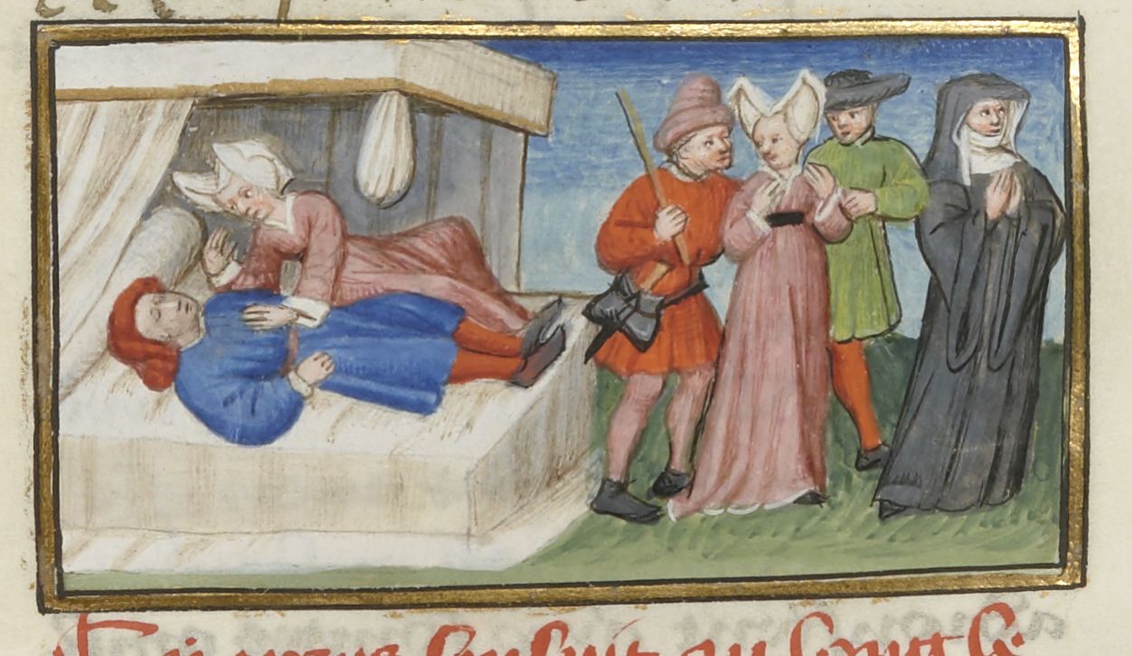 Parigi, Bibliothèque Nationale de France, Fr. 239, f. 127v. Gabriotto cade morto sul letto tra le braccia di Andreuola; la donna viene arrestata, e infine si fa monaca.