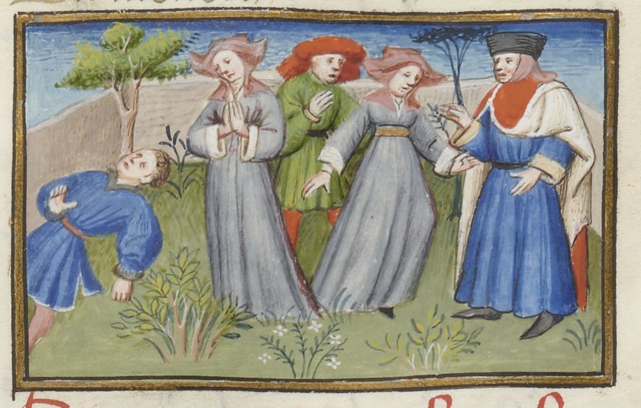 Parigi, Bibliothèque Nationale de France, Fr. 239, f. 130r. In un giardino, Simona piange sul corpo di Pasquino, avvelenato dalla salvia; per dimostrare la propria innocenza, Simona si avvelena anch'essa di fronte ai suoi accusatori.