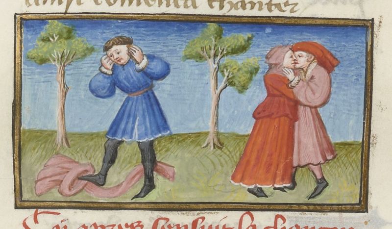 Scuola del Maestro del Duca di Bedford (1430 c.), Filostrato canta la ballata di un amante infelice