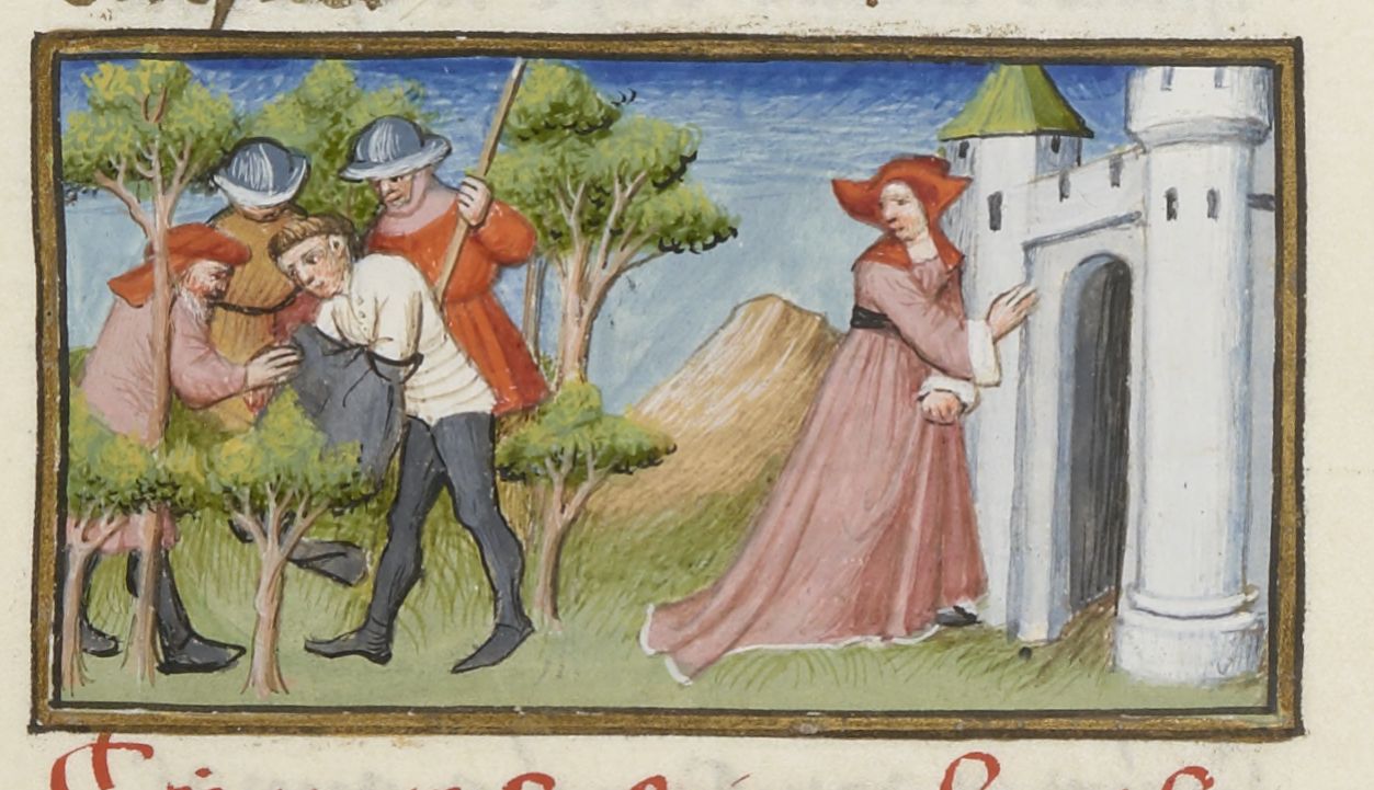 Parigi, Bibliothèque Nationale de France, Fr. 239, f. 148r. Pietro Boccamazza viene aggredito nel bosco e spogliato dai briganti, mentre l'Agnolella riesce a fuggire e a raggiungere un castello.