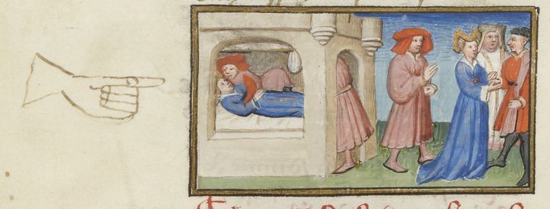 Parigi, Bibliothèque Nationale de France, Fr. 239, f. 150v. Lizio da Valbona sorprende la figlia Caterina a letto con l'amante Ricciardi; Lizio acconsente al matrimonio della coppia.