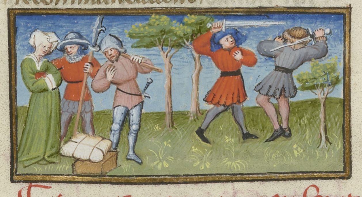 Parigi, Bibliothèque Nationale de France, Fr. 239, f. 152v. Giannole e Minghino tentano di rapire Agnesa; i due uomini si battono con le spade.