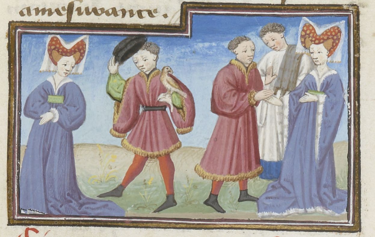 Parigi, Bibliothèque Nationale de France, Fr. 239, f. 162r. Federigo degli Alberighi, con il proprio falcone sul pugno, saluta monna Giovanna; Federigo e Giovanna si uniscono in matrimonio.