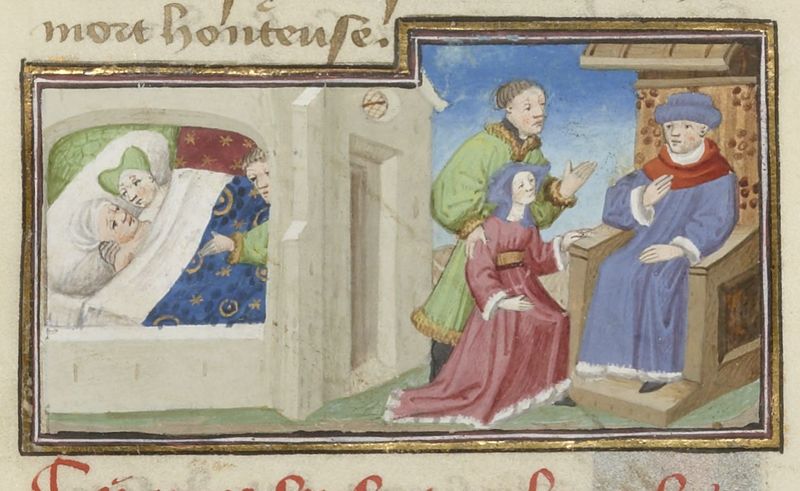 Parigi, Bibliothèque Nationale de France, Fr. 239, f. 176v. Filippa viene scoperta dal marito durante l'adulterio; la donna viene condotta dinanzi al giudice, dove difende la sua condotta.