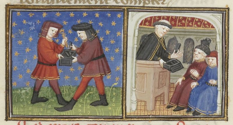 Parigi, Bibliothèque Nationale de France, Fr. 239, f. 179v. Giovanni del Bragoniera e Biagio Pizzini scambiano la piuma dell'angelo di fra' Cipolla con dei carboni; il frate mostra i carboni ai paesani spacciandoli per una reliquia.