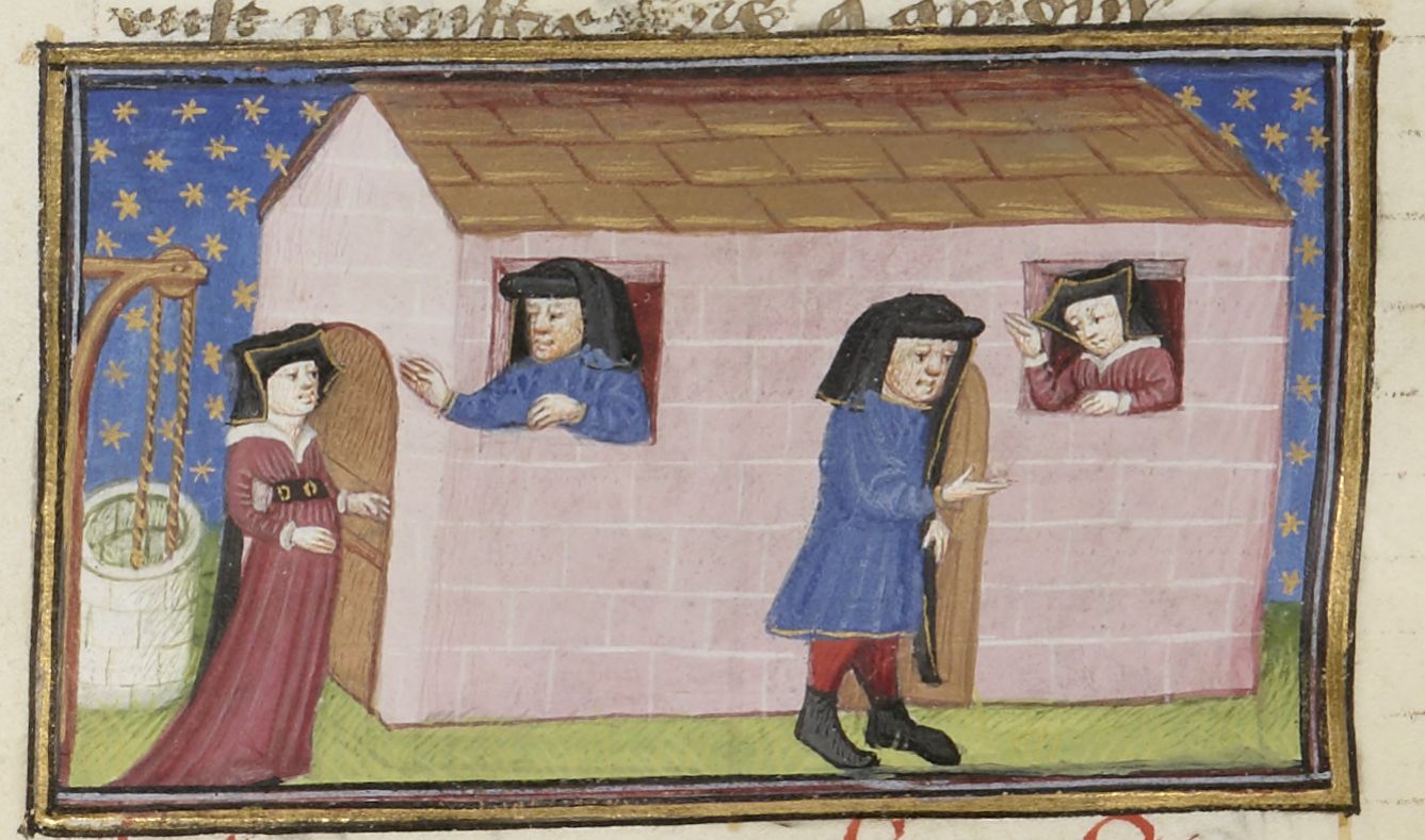 Parigi, Bibliothèque Nationale de France, Fr. 239, f. 191v. Tofano chiude la moglie Ghita fuori casa, così la donna richiama la sua attenzione gettando una pietra nel pozzo; per ripicca la donna chiude a sua volta il marito fuori casa.