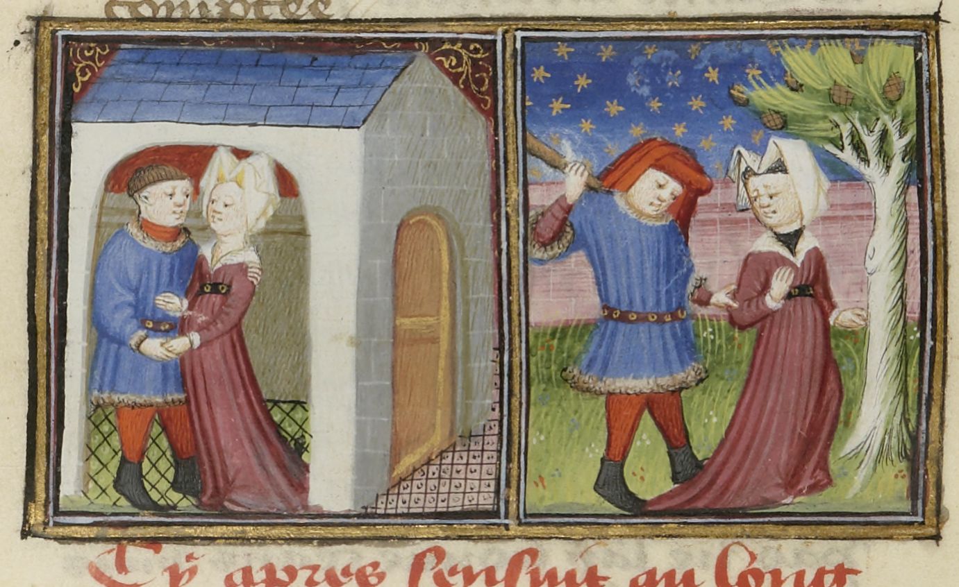 Parigi, Bibliothèque Nationale de France, Fr. 239, f. 198v. Lodovico si trova insieme all'amante Beatrice; Lodovico bastona Egano, vestito con gli abiti della moglie.