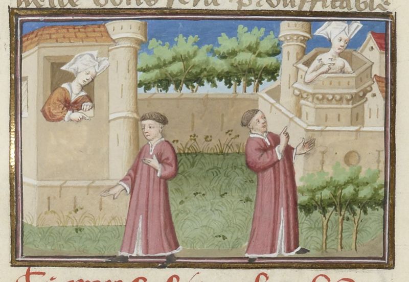 Parigi, Bibliothèque Nationale de France, Fr. 239, f. 225r. La vedova Elena chiude Rinieri fuori casa; per vendetta Rinieri lascia la donna nuda in cima ad una torre, esposta al sole ed agli insetti.
