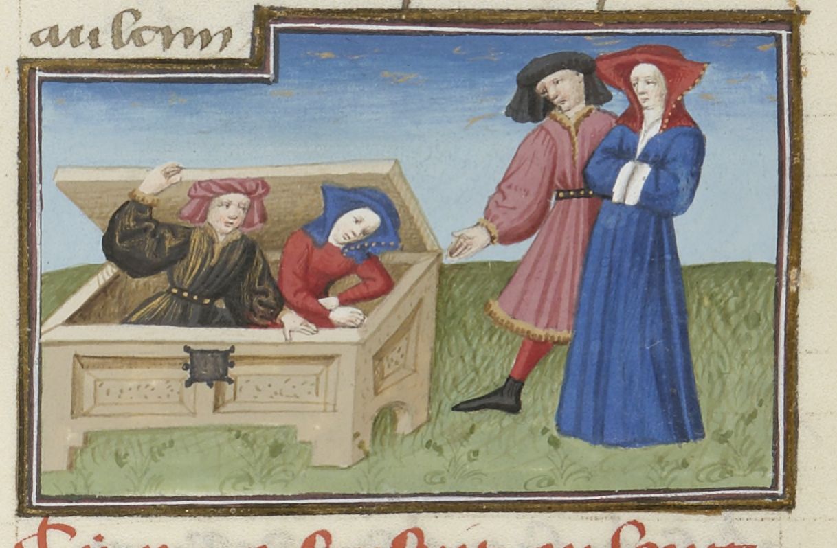 Parigi, Bibliothèque Nationale de France, Fr. 239, f. 234v. Una coppia (Spinelloccio e la moglie?) si nasconde in una cassa, mentre un'altra coppia (Zeppa e la moglie?) osserva la scena.