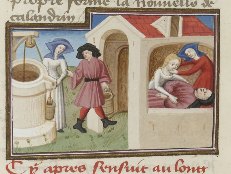 Parigi, Bibliothèque Nationale de France, Fr. 239, f. 253v. Calandrino incontra Niccolosa al pozzo e la invita a seguirlo; la moglie di Calandrino sorprende il marito con Niccolosa e aggredisce la donna.