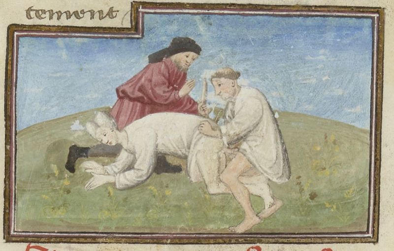 Parigi, Bibliothèque Nationale de France, Fr. 239, f. 264v. Gianni di Barolo tenta di attaccare la coda di cavalla alla moglie di Pietro da Tresanti.