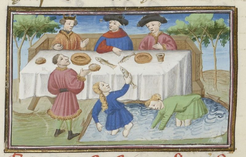 Parigi, Bibliothèque Nationale de France, Fr. 239, f. 277v. Re Carlo I, ospite alla tavola di Neri degli Uberti, osserva le figlie del cavaliere mentre si dedicano alla pesca.