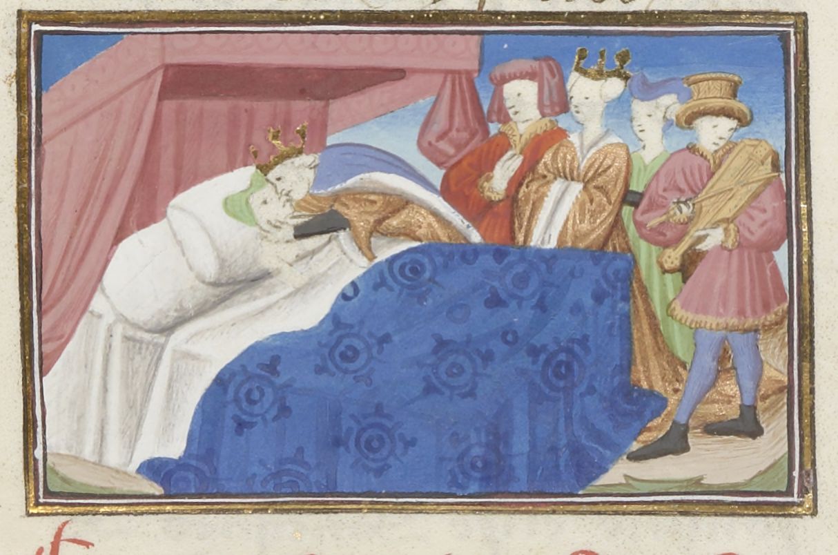 Parigi, Bibliothèque Nationale de France, Fr. 239, f. 280r. Lisa, inferma nel letto, riceve la visita del re accompagnato dalla regina, dal musico Minuccio e da altri personaggi della corte.