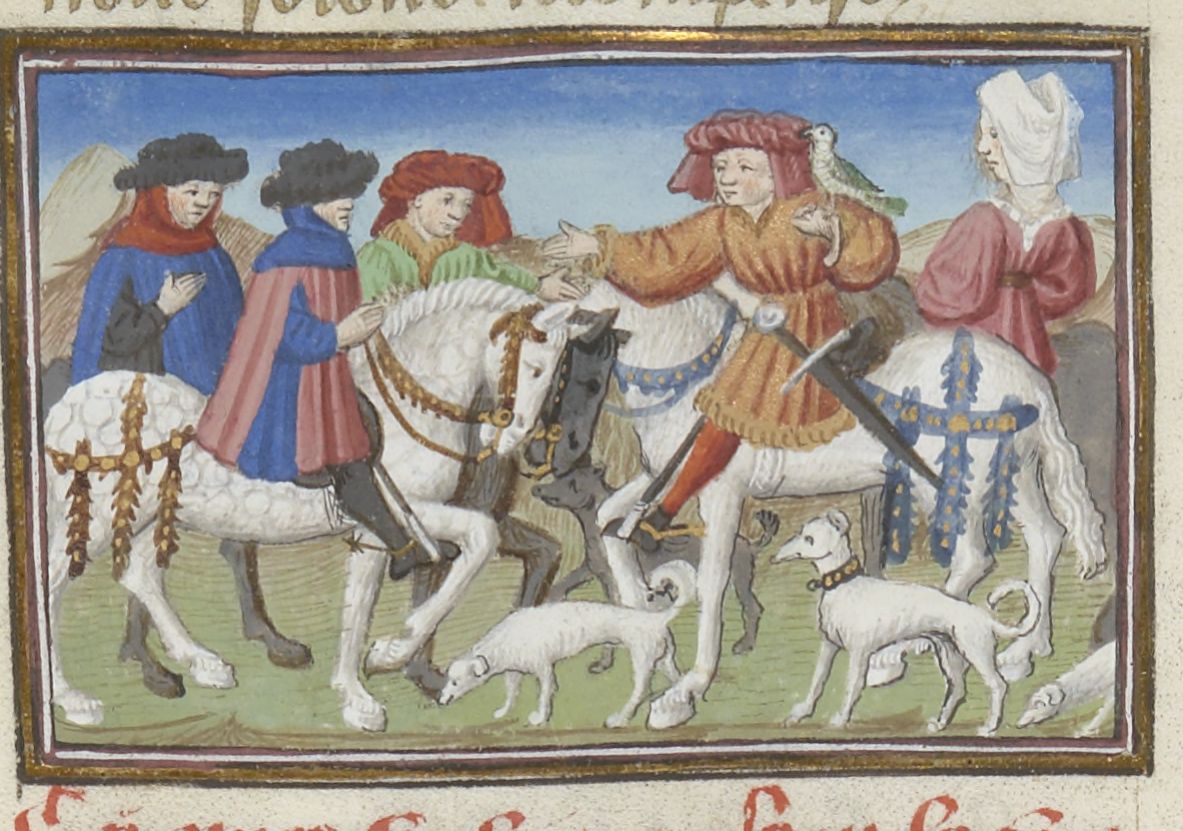 Parigi, Bibliothèque Nationale de France, Fr. 239, f. 289v. Messer Torello, a cavallo con il falcone e i suoi cani, incontra il Saladino e alcuni dei suoi servitori.