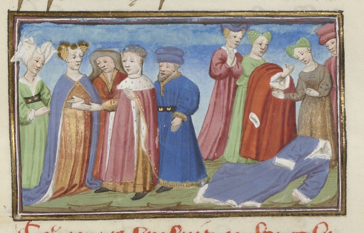 Parigi, Bibliothèque Nationale de France, Fr. 239, f. 295r. Viene celebrato il matrimonio tra Gualtieri e Griselda; Griselda, ripudiata dal marito, viene spogliata delle vesti marchionali e cacciata dalla sua casa.