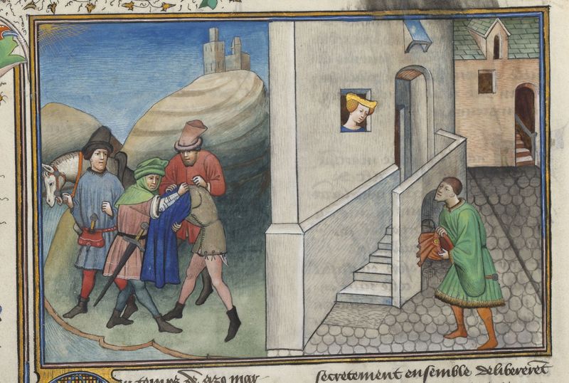 Parigi, Bibliothèque de l'Arsenal, 5070, f. 43v. Il copista del manoscritto è Guillebert de Mets. Il mercante Rinaldo d'Asti viene derubato e spogliato da tre banditi sulla strada per Verona; Rinaldo, dopo aver ricevuto nuovi vestiti, si congeda dalla vedova che lo ha soccorso.