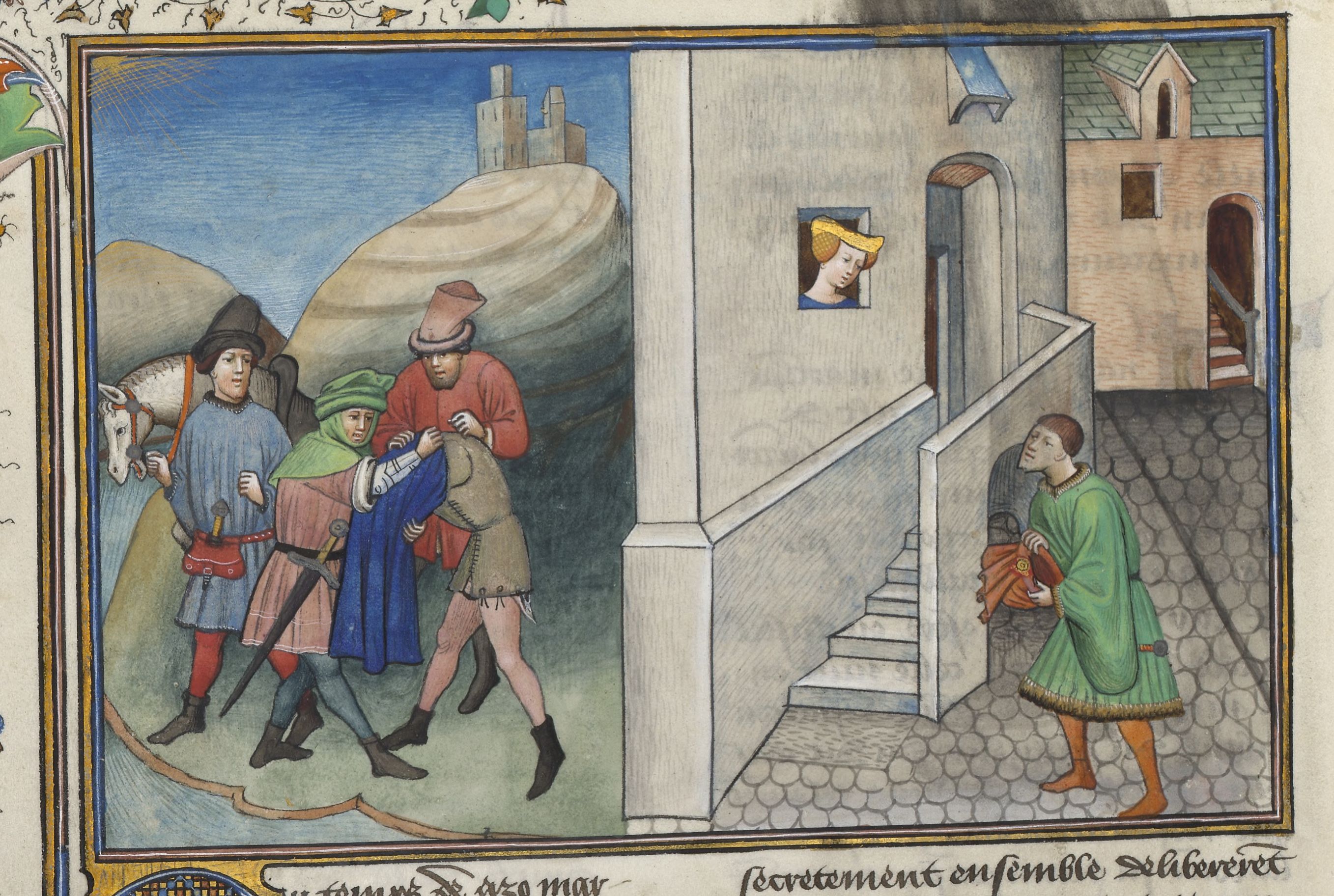 Maestro di Guillebert de Mets (1430-1450), Rinaldo d'Asti viene derubato; Rinaldo si congeda dalla vedova