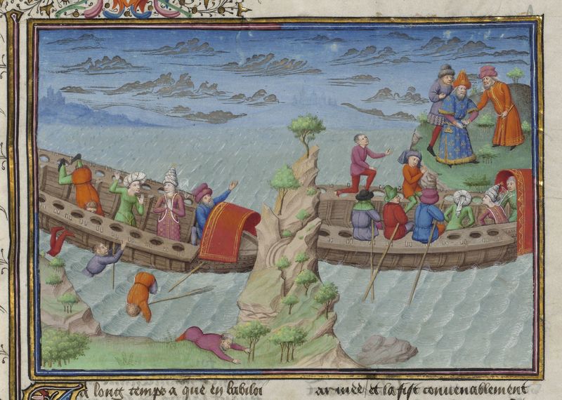 Parigi, Bibliothèque de l'Arsenal, 5070, f. 67r. Il copista del manoscritto è Guillebert de Mets. La nave di Alatiel fa naufragio; alla fine del viaggio Alatiel ritorna in nave dal re suo padre e dal suo promesso sposo.