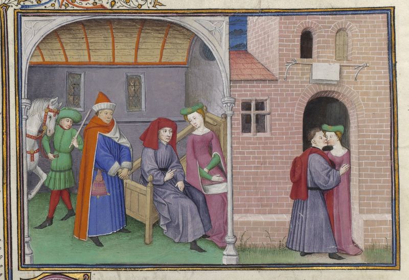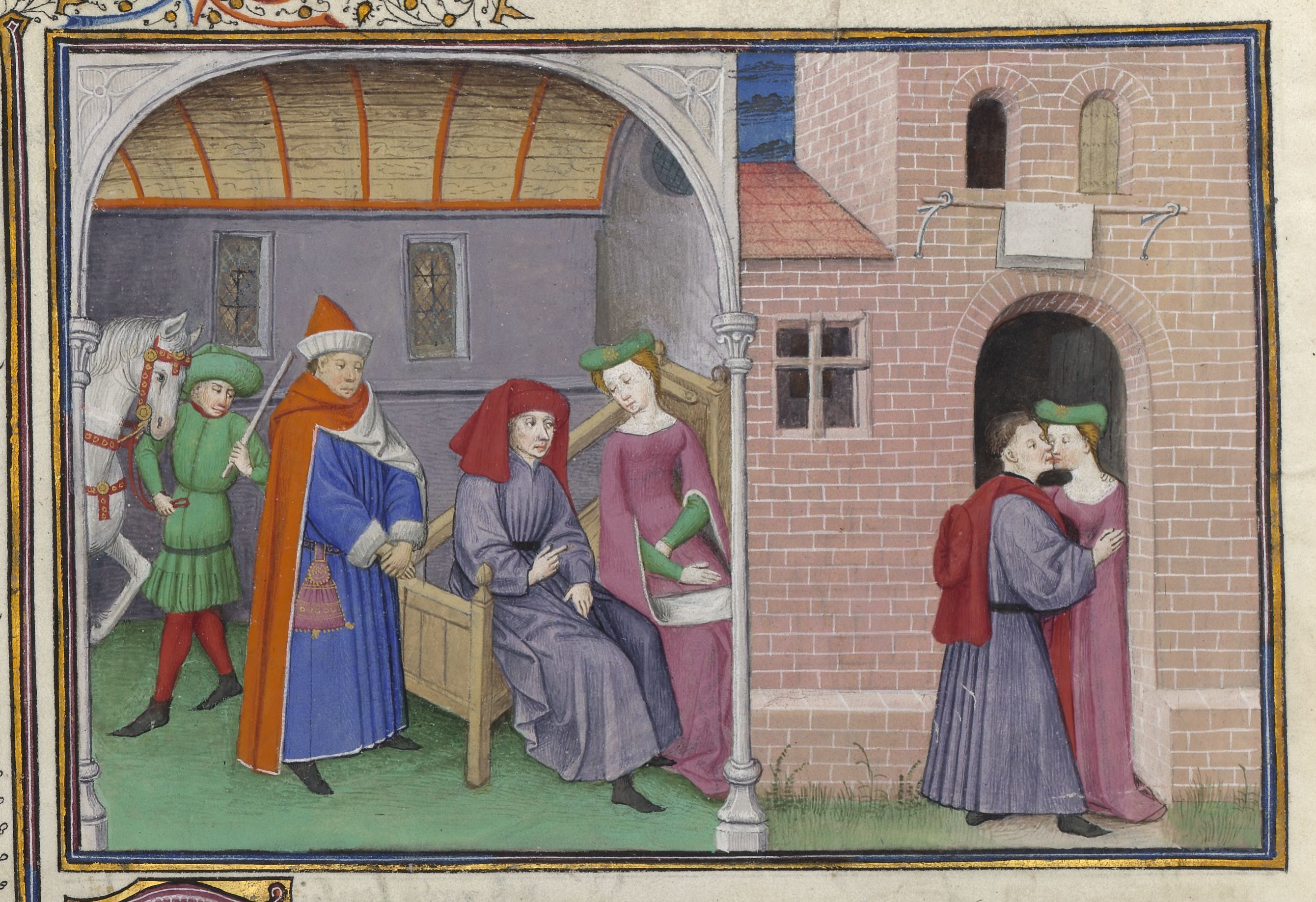 Maestro di Jean Mansel (1430-1450), Francesco Vergellesi concede a Zima di parlare con sua moglie; Zima e la moglie di Francesco si scambiano un bacio