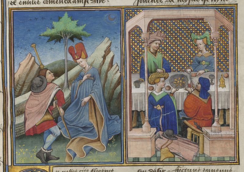 Parigi, Bibliothèque de l'Arsenal, 5070, f. 120r. Il copista del manoscritto è Guillebert de Mets. Tedaldo, travestito da pellegrino, spinge monna Ermellina a confessarsi; durante un banchetto Tedaldo rivela la sua vera identità.