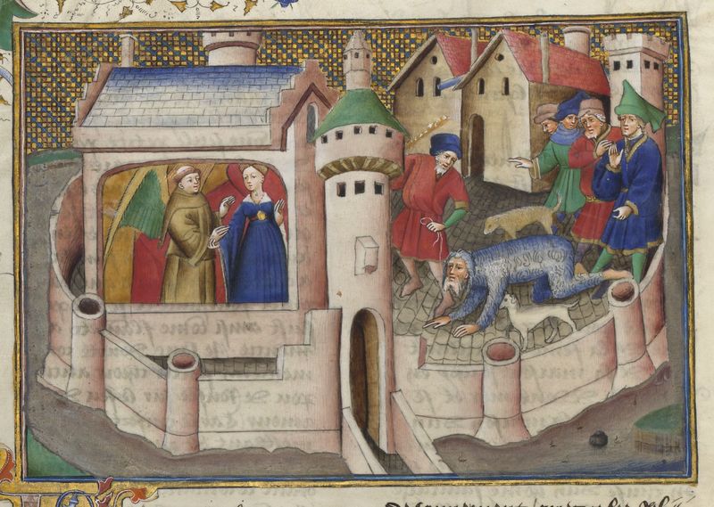 Parigi, Bibliothèque de l'Arsenal, 5070, f. 150v. Il copista del manoscritto è Guillebert de Mets. Frate Alberto, travestito da angelo Gabriele, visita madonna Lisetta; Alberto, vestito da uomo selvatico, viene trascinato per strada e vituperato dalla folla.