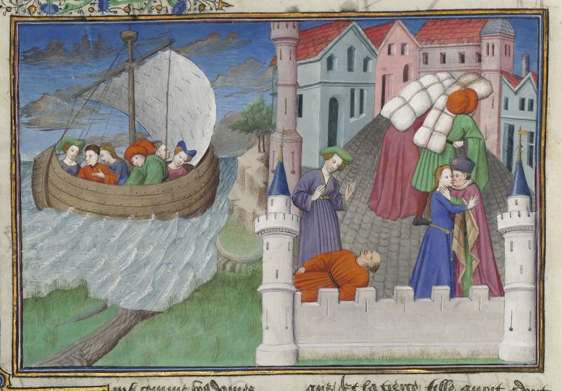 Parigi, Bibliothèque de l'Arsenal, 5070, f. 155v. Il copista del manoscritto è Guillebert de Mets. Tre sorelle con i loro mariti salpano verso Creta; all'interno della città sono raffigurati Ninetta sul corpo del marito avvelenato, Magdalena mentre bacia il duca di Creta, Bertella e Ughetto in fuga verso Rodi.