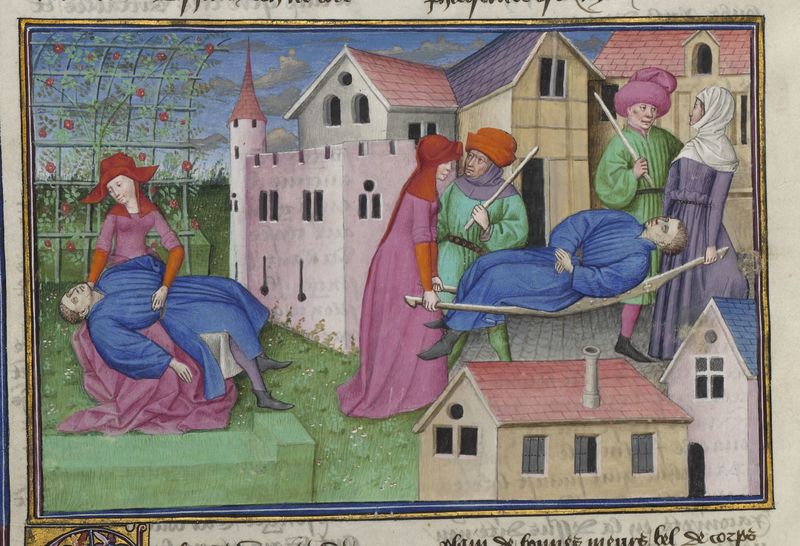 Parigi, Bibliothèque de l'Arsenal, 5070, f. 164v. Il copista del manoscritto è Guillebert de Mets. Gabriotto muore tra le braccia di Andreuola; Andreuola e la fantesca, trasportando il corpo di Gabriotto, vengono fermate dal podestà.