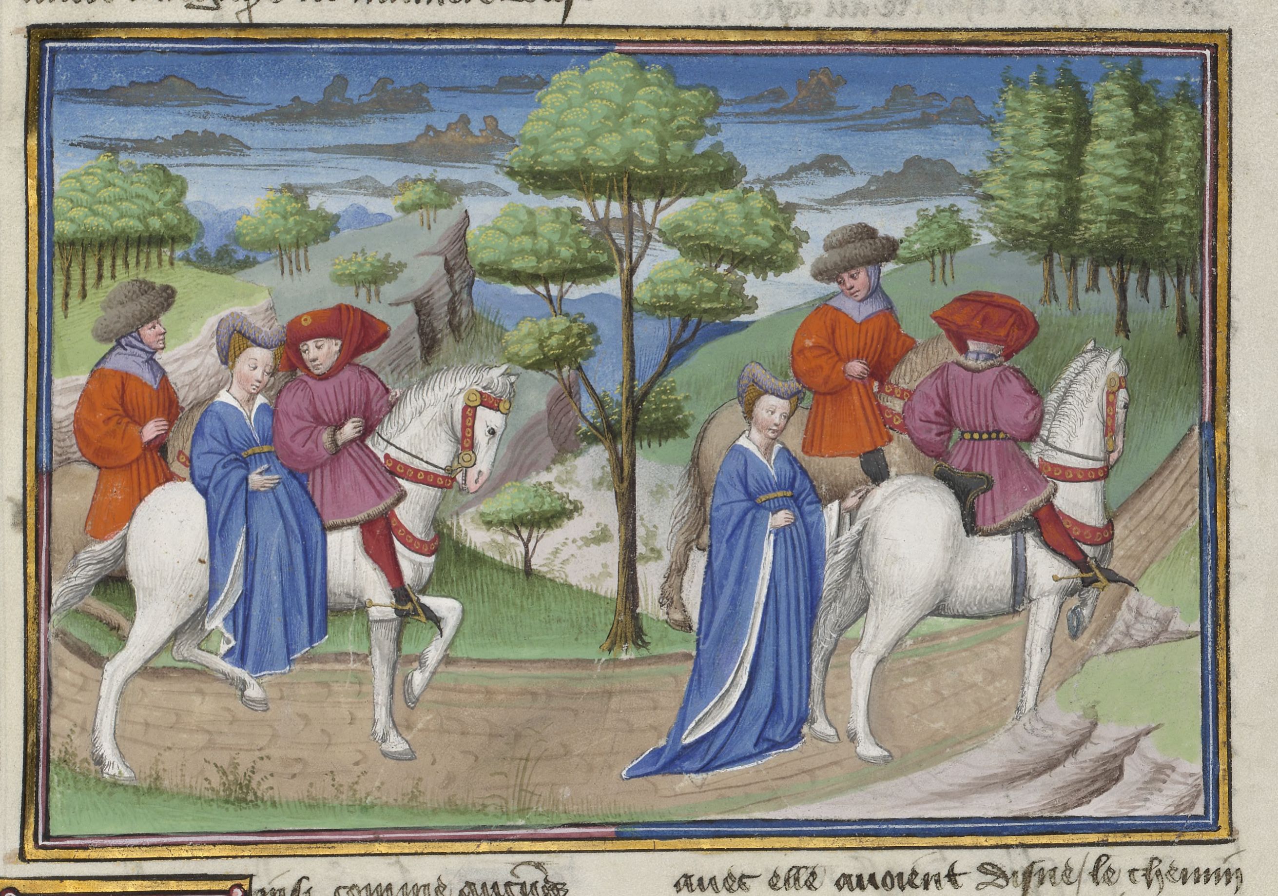 Maestro di Jean Mansel (1430-1450), Madonna Oretta accetta il passaggio di un cavaliere; Oretta scende da cavallo