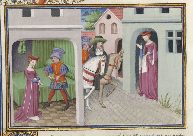 Parigi, Bibliothèque de l'Arsenal, 5070, f. 225v. Il copista del manoscritto è Guillebert de Mets. Nonna de' Pulci riceve 500 fiorini falsi da messer Diego Della Ratta; la donna motteggia il vescovo Antonio d'Orso e messer Della Ratta.