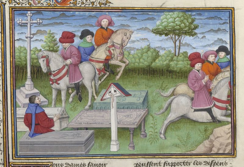 Parigi, Bibliothèque de l'Arsenal, 5070, f. 234v. Il copista del manoscritto è Guillebert de Mets. Betto Brunelleschi e la sua brigata si fermano a conversare con Guido Cavalcanti al cimitero di San Giovanni; allontanandosi a cavallo, Betto spiega ai suoi amici le parole di Guido.