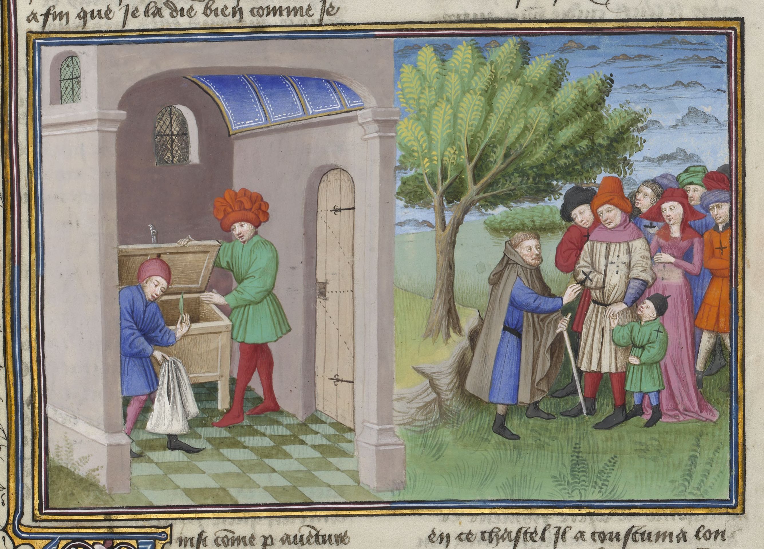 Maestro di Jean Mansel (1430-1450), Giovanni del Bragoniera e Biagio Pizzini rubano la reliquia a fra' Cipolla; il frate segna le vesti dei paesani con i carboni