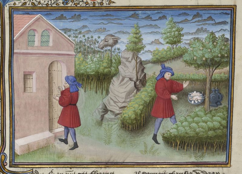Parigi, Bibliothèque de l'Arsenal, 5070, f. 244r. Il copista del manoscritto è Guillebert de Mets. Federigo, avendo visto la testa dell'asino posta come segnale nel vigneto, bussa alla porta di monna Tessa; l'uomo trova del cibo e del vino lasciati sotto un pesco dall'amante.