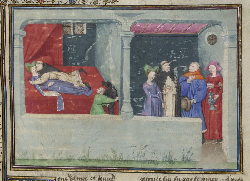 Parigi, Bibliothèque de l'Arsenal, 5070, f. 249r. Il copista del manoscritto è Guillebert de Mets. Frate Rinaldo giace con la madre del proprio figlioccio; il frate viene ricompensato dal marito della donna per la presunta guarigione del bambino.
