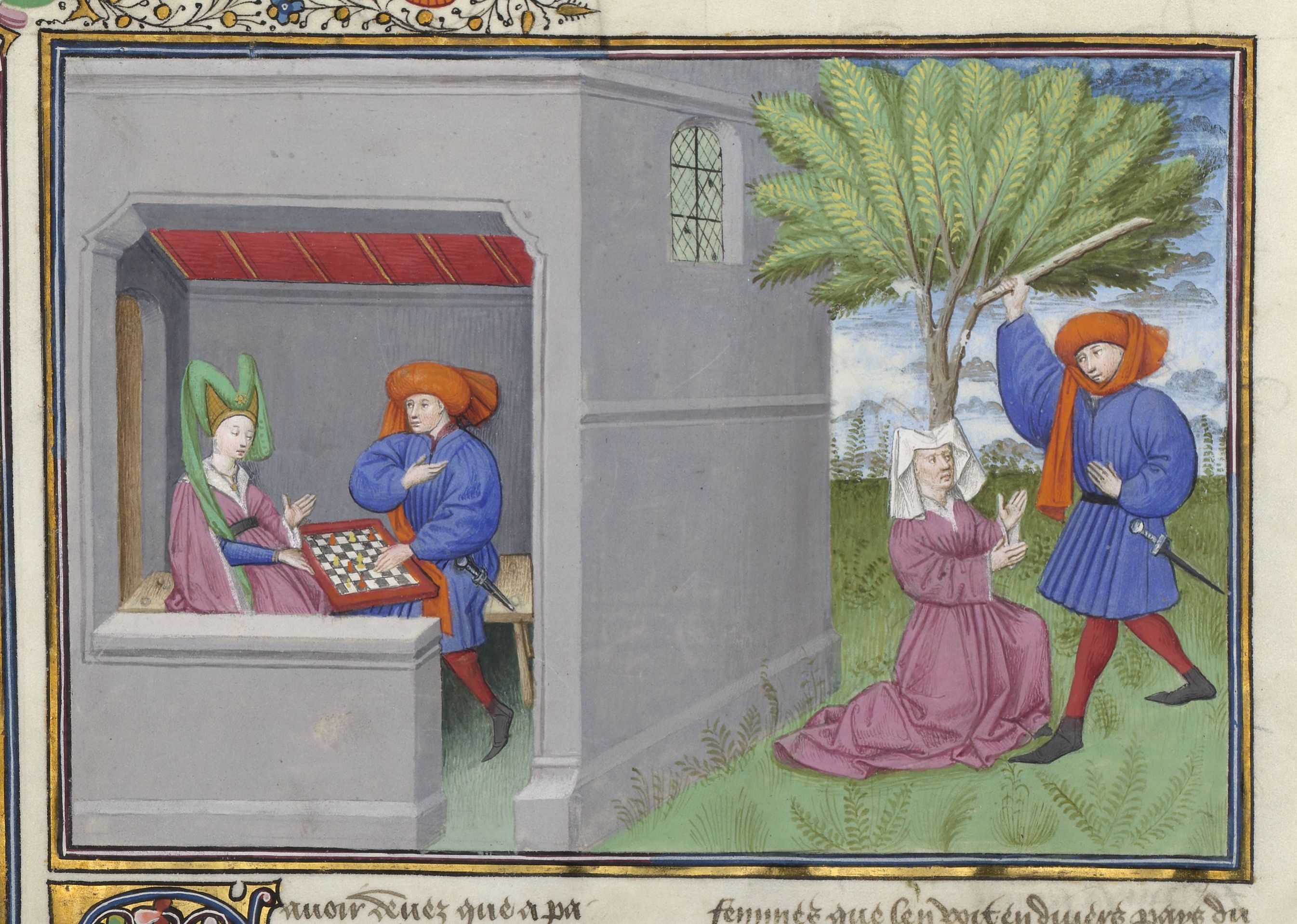 Parigi, Bibliothèque de l'Arsenal, 5070, f. 260v. Il copista del manoscritto è Guillebert de Mets. Lodovico gioca a scacchi con Beatrice, lasciandola vincere; Lodovico bastona Egano, il quale è travestito da sua moglie.