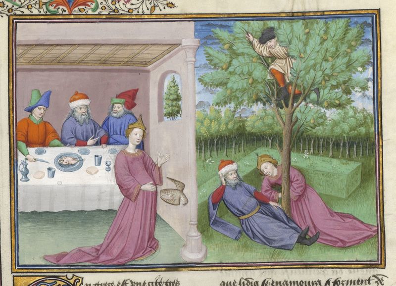 Parigi, Bibliothèque de l'Arsenal, 5070, f. 267v. Il copista del manoscritto è Guillebert de Mets. Lidia uccide lo sparviero di suo marito Nicostrato durante un banchetto; Lidia e Nicostrato conversano distesi in un prato, mentre Pirro è nascosto tra i rami di un pero.