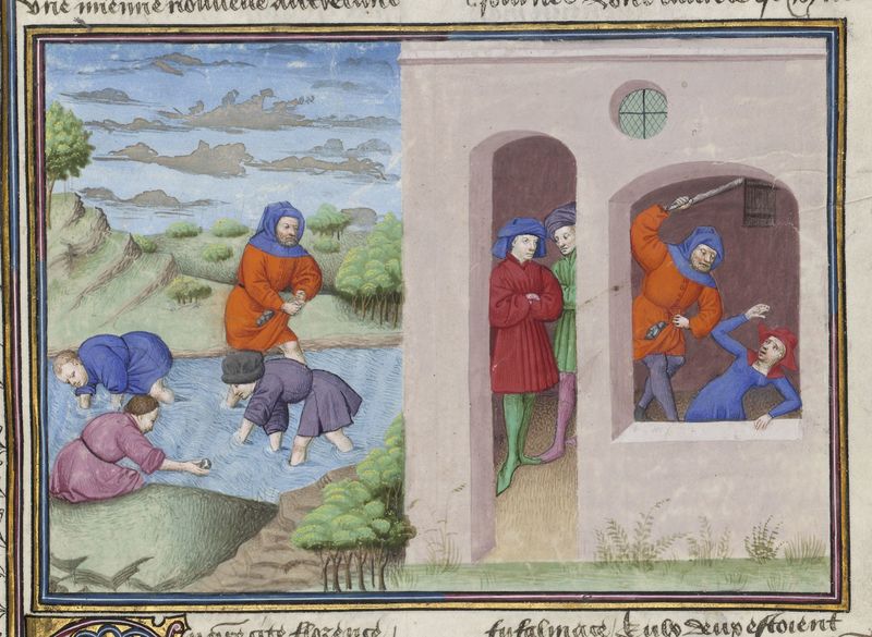 Maestro di Jean Mansel (1430-1450), Calandrino e i suoi amici cercano l'elitropia nel Mugnone; Calandrino bastona sua moglie