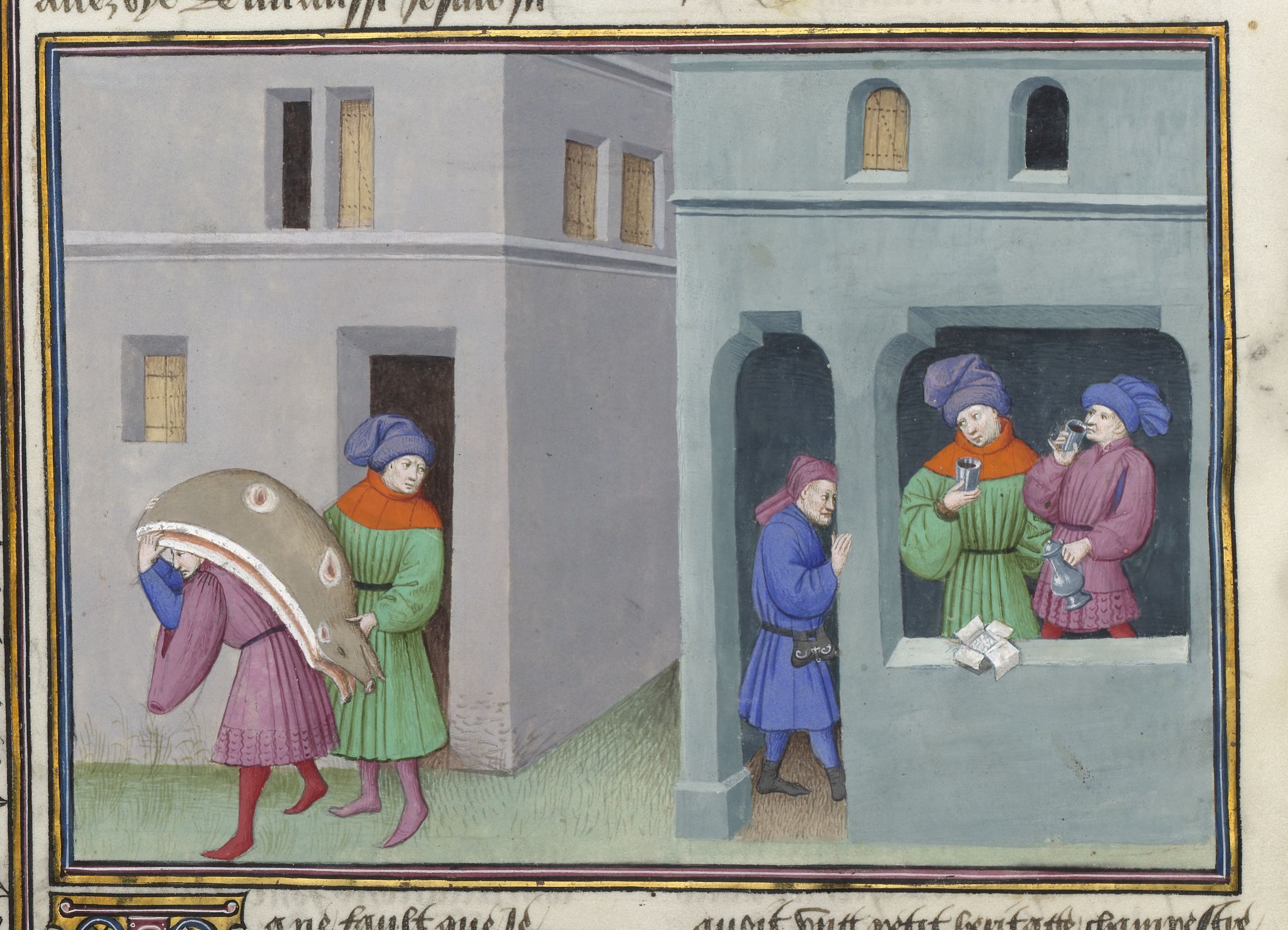 Maestro di Jean Mansel (1430-1450), Bruno e Buffalmacco rubano il maiale a Calandrino; Bruno e Buffalmacco bevono dopo aver mangiato le gallette
