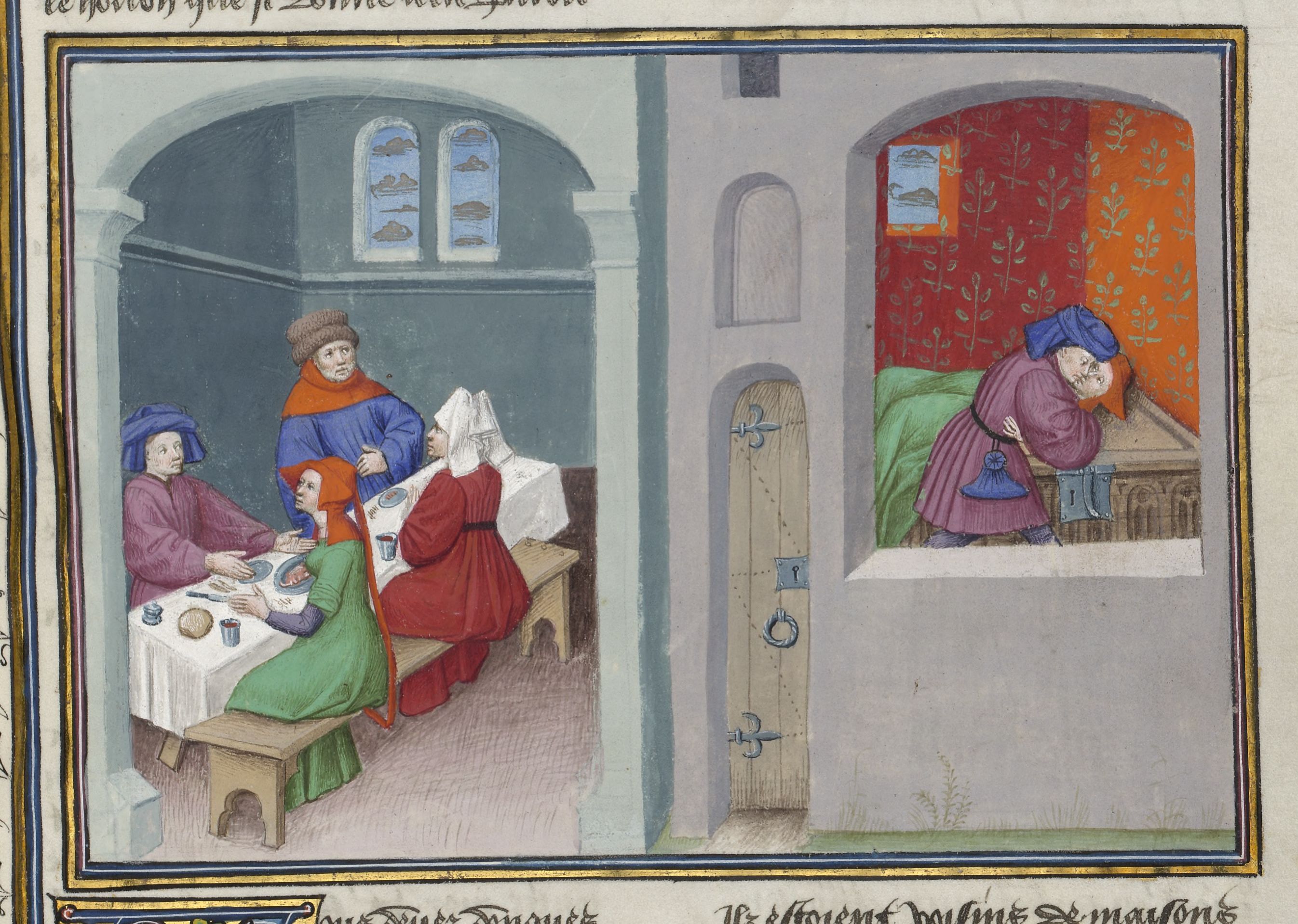 Maestro di Jean Mansel (1430-1450), Spinelloccio e Zeppa siedono a tavola con le loro mogli; Zeppa si bacia con la moglie di Spinelloccio