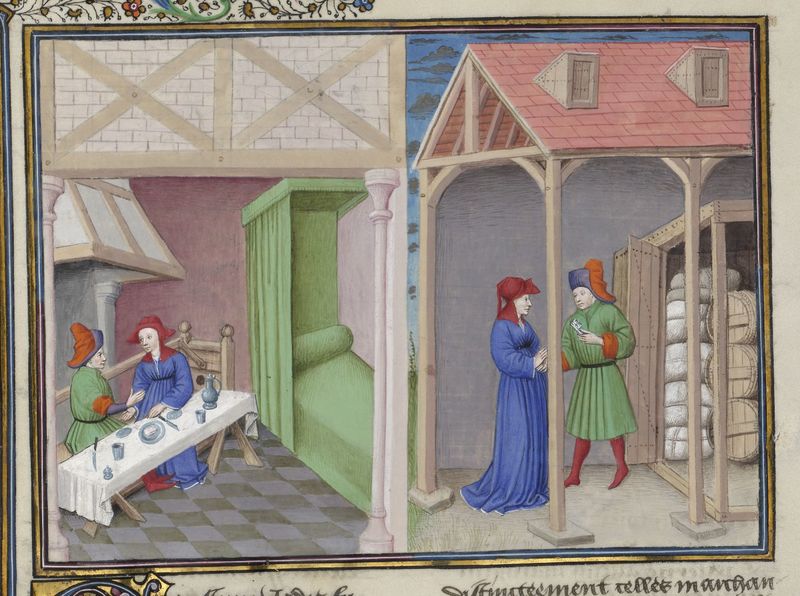 Parigi, Bibliothèque de l'Arsenal, 5070, f. 314r. Il copista del manoscritto è Guillebert de Mets. Salabaetto siede a tavola con Iancofiore; Salabaetto si fa consegnare la chiave del magazzino per poterla custodire.