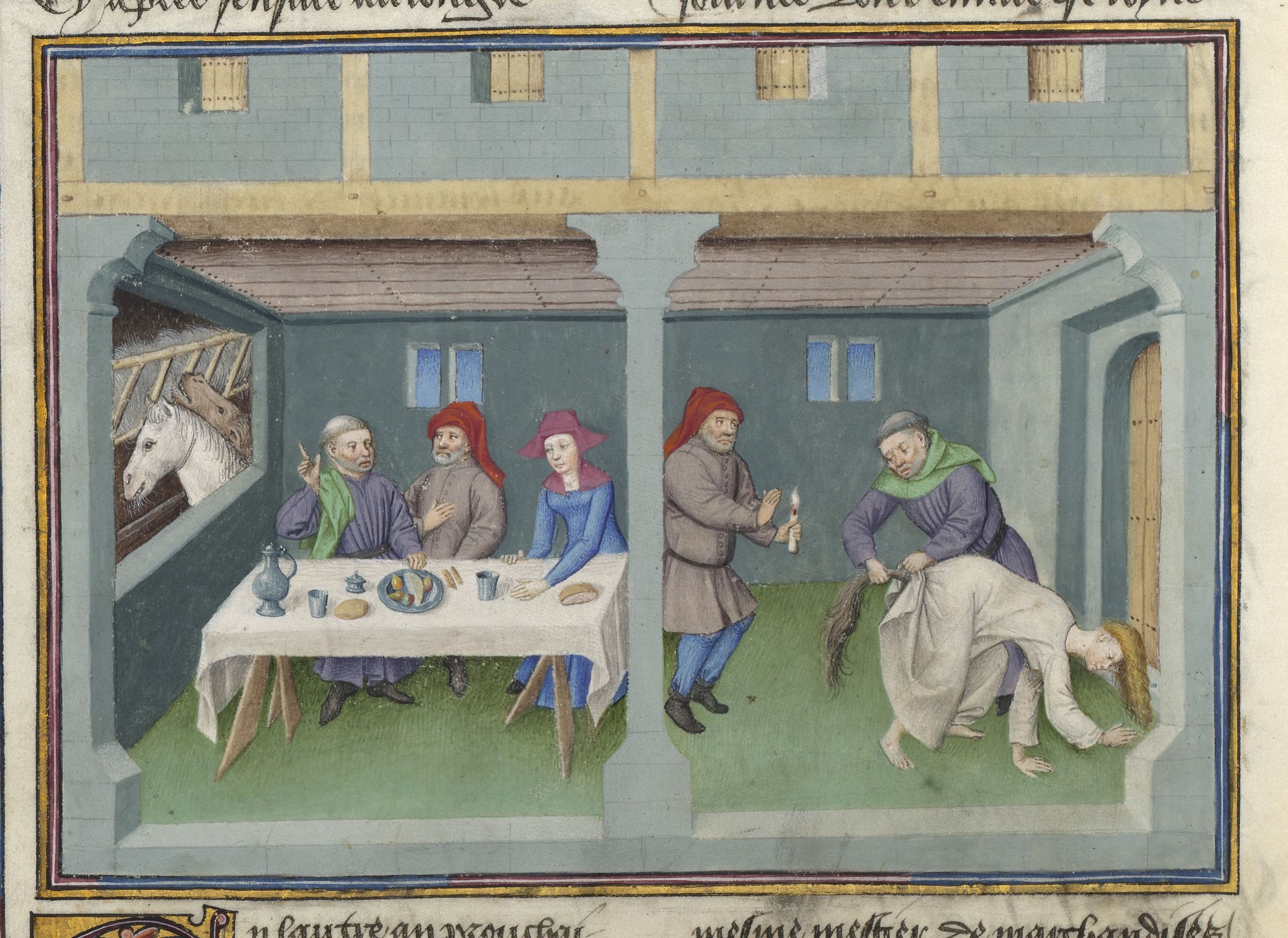 Parigi, Bibliothèque de l'Arsenal, 5070, f. 347v. Il copista del manoscritto è Guillebert de Mets. Donno Gianni di Barolo siede a tavola con Pietro da Tresanti e sua moglie; Pietro interrompe donno Gianni mentre questi tenta di attaccare la coda di cavallo alla donna.