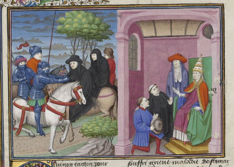 Maestro di Jean Mansel (1430-1450), Ghino di Tacco cattura l'abate di Clignì; l'abate intercede per Ghino presso il Papa