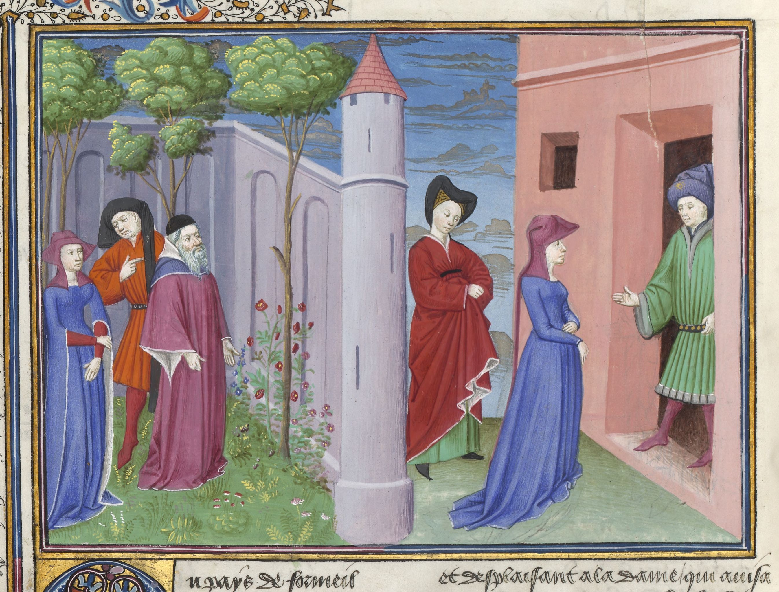Parigi, Bibliothèque de l'Arsenal, 5070, f. 362v. Il copista del manoscritto è Guillebert de Mets. Ansaldo chiede ad un negromante di far fiorire il giardino d'inverno per conquistare Dianora; Ansaldo rinuncia alla donna per permetterle di ritornare dal marito Gilberto.